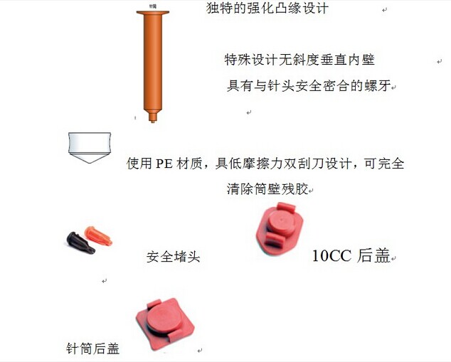 点胶针筒组件均不含有机硅及氯化物以确保工业等级,均采用嵌入式,边缘不松脱,无斜度,无气泡,内壁紧密配合活塞,确保吐出液体流畅,绝不滴漏,增强厚度惰性,PP,材质筒壁绝不破裂,不易于化学产品产生作用.用活塞采用惰性,PP,材质,双括刀设计,确保与点胶针筒紧密配合,确保无液体残留,适合大部分液体.